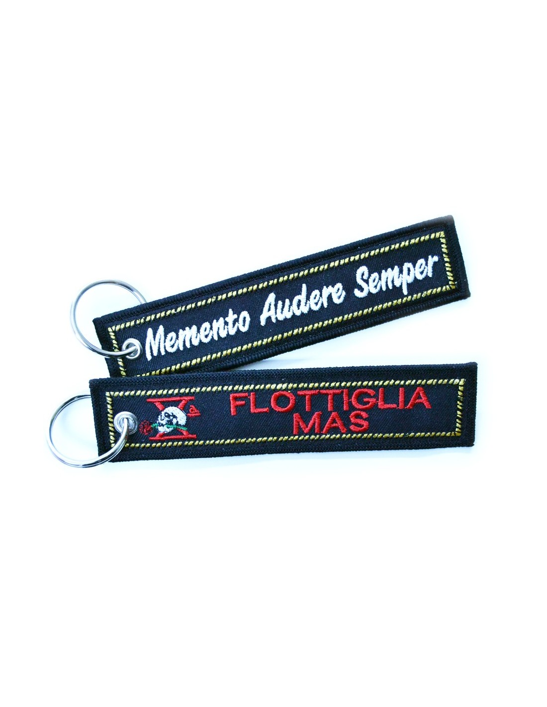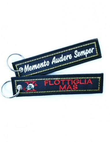 Portachiavi in tessuto ricamato X Flottiglia Mas su un lato e sull'altro il famoso motto "Memento Audere Semper"