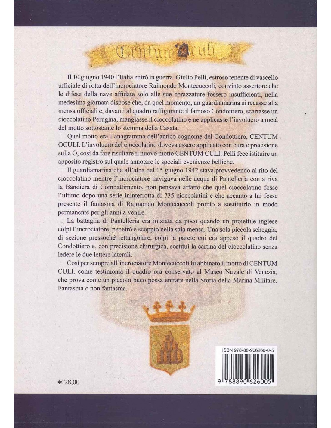 Quel motto era l'anagramma dell'antico cognome del Condottiero, CENTUM OCULI. L'involucro del cioccolatino doveva essere applicato con cura e precisione sulla O, così da fare risultare il nuovo motto CENTUM CULI. Pelli fece istituire un apposito registro sul quale annotare le speciali evenienze belliche.