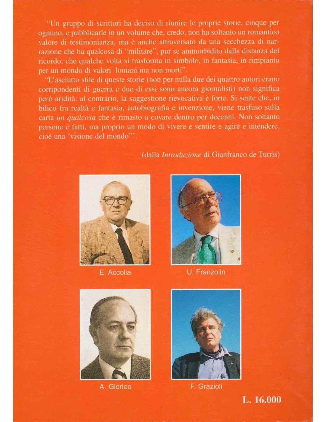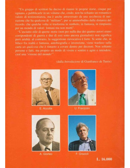 "Un gruppo di scrittori ha deciso di riunire le proprie storie, cinque per ognuno, e pubblicarle in un volume che, credo, non ha soltanto un romantico valore di testimonianza. ma è anche attraversato da una secchezza di narrazione che ha qualcosa di "militare", pur se ammorbidito dalla distanza del ricordo, che qualche volta sì trasforma in simbolo, in fantasia, in rimpianto per un mondo di valori lontani ma non morti".
